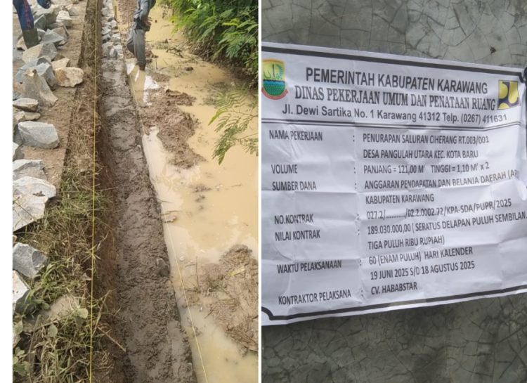 KARAWANG-Zonadinamikanews.com. Pelaksanaan Penurapan saluran Ciherang RT.003/001 Desa Pangulah utara , Kecamatan Kotabaru kab.karawang dari CV.Hababstar terkesan semaunya saja. Pada pekerjaan pasangan batu belah di proyek ini, untuk pondasi Turap Penahan Tanah (TPT) terindikasi melenceng dari standar RAB yang dikeluarkan 027.2/…./022000272/KPA- SDA/ PUPR.189030.000.00 (Seratus delapan puluh sembilan juta tiga puluh ribu rupiah ) 60 hari kerja