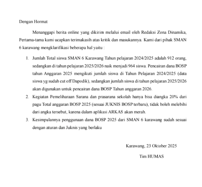 KARAWANG-Zonadinamikanews.com.Menanggapi akan pemberitaan media ini yang berjudul “Penyerapan Dana BOS SMAN 6 Karawang di pertanyakan”, pihak sekolah memberikan tanggapan yang di kirim melalui email redaksi media ini.