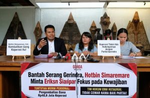 Di tengah suasana tegang konferensi pers di Gorga Resto, Hotbin membedah akar persoalan yang selama ini dianggap “abu-abu”. Dengan nada tinggi dan tegas, ia menyatakan bahwa kliennya sama sekali tidak berniat menyerang institusi Partai Gerindra.