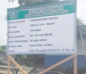 Berdasarkan kalkulasi perhitungan belanjan barang dan jasa harga satuan Pemerintah Daerah Sidoarjo, kegiatan pavingisasi di RT04-RW04 dusun Pulosari (patuk), Desa Prambon dengan nilai anggaran tahun 2025 sebesar Rp 141.120.000, dengan luasan 840m² ini dituding para lbaga anti korupsi kuat sengaja melebihkan biaya anggaran.