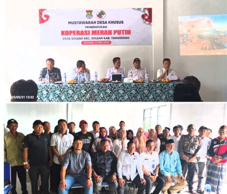 TANGERANG-Zonadinamikanews.com.Pemerintah Desa Solear dan masyarakat menggelar Musyawarah Desa Khusus ( Musdesus ) terkait pembentukan koperasi Desa Merah Putih bertempat di kantor desa Solear, kecamatan solear, kabupaten Tangerang,Rabu,21/5/2025.