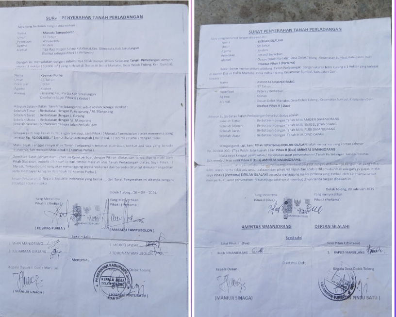 Anehnya lagi kata Muliadi Siboro , Oknum kades diduga keras turut serta menjual lahan tersebut satu objek diduga lahan hutan dua kali diperjual belikan dan dua kali jga ditanda tangani oleh kepala desa H Pintu Batu.