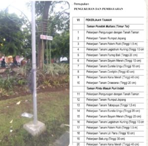 Kegiatan revitalisasi Taman Pondok Mutiara (timur tol) pembangunan taman pintu masuk Puri Indah, dengan nilai pagu Rp356.000.000, yang di laksanakan CV AFLA SEJAHTERA, tahun anggaran 2025, diduga tidak sesuai spesifikasi dan terlepas dari pengawasan, terkait prihal spesifikasi tanaman yang harus ditanam di area taman.
