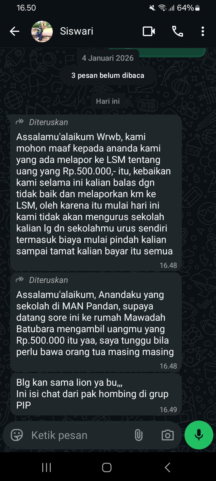 Mirisnya, ketika bobrok pihak sekolah sampai ke kuping LSM, spontan saja bagian operator sekolah mengirimkan pesan singkat pada siswa, dengan ancaman tidak akan mengurus lagi para siswa.