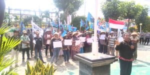Dengan membawa poster berisi penolakan program food estate dan bendera biru bergambar petani dan nelayan bertuliskan lawan penggusuran, warga berunjuk rasa, menuntut sengketa lahan di perbatasan Nusakambangan yang mereka garap selama puluhan tahun agar segera diselesaikan.